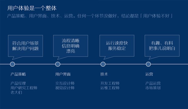 回到互联网产品上来,我以前曾经总结过,影响互联网产品用户体验的主要有4个因素,这些因素其实都是需要设计的,这其中任何一个“设计”不合理,结论都是“用户体验不好”。它们分别是:产品策略、用户界面、技术、运营。